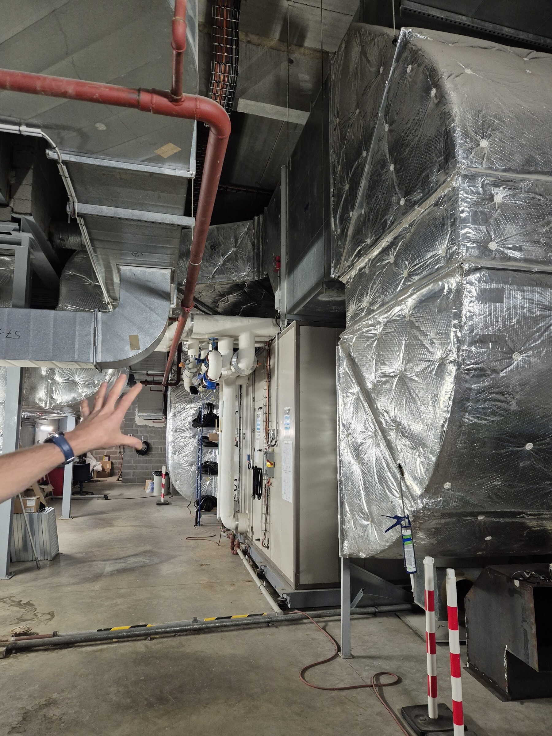 À mesure que la visite progresse, les volumes s’agrandissent. Derrière des portes techniques se cachent les véritables poumons du CID : les centrales de traitement d’air.